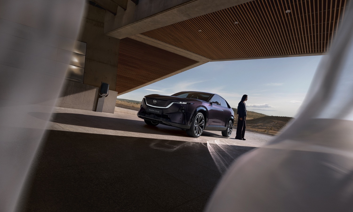 El diseño exterior evoluciona el lenguaje Kodo (“Alma del movimiento”) adaptado a la nueva era cero emisiones. Destaca la parrilla tipo ala iluminada, con secuencias de luz que refuerzan su estilo tecnológico, y faros delanteros muy finos integrados con la firma luminosa. En versiones superiores puede montar retrovisores digitales por cámara, más aerodinámicos, mientras que la zaga luce ópticas horizontales estilizadas y canalizaciones de aire. La gama incluye siete colores, sobresaliendo el Nightfall Violet junto a clásicos como Soul Red Crystal o Machine Grey.