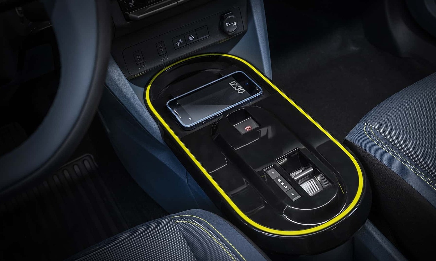 Dentro de él va el cuadro de instrumentos digital configurable de 10 pulgadas y la pantalla central táctil del infotainment de 10,25 pulgadas. Más abajo están las salidas de aire y los mandos para gestionar el clima y funciones como el desempañalunas. Por último, tenemos otro óvalo central a modo de túnel central que integra la base del cargador inalámbrico para móviles, el freno de mano eléctrico y el selector de la transmisión automática.