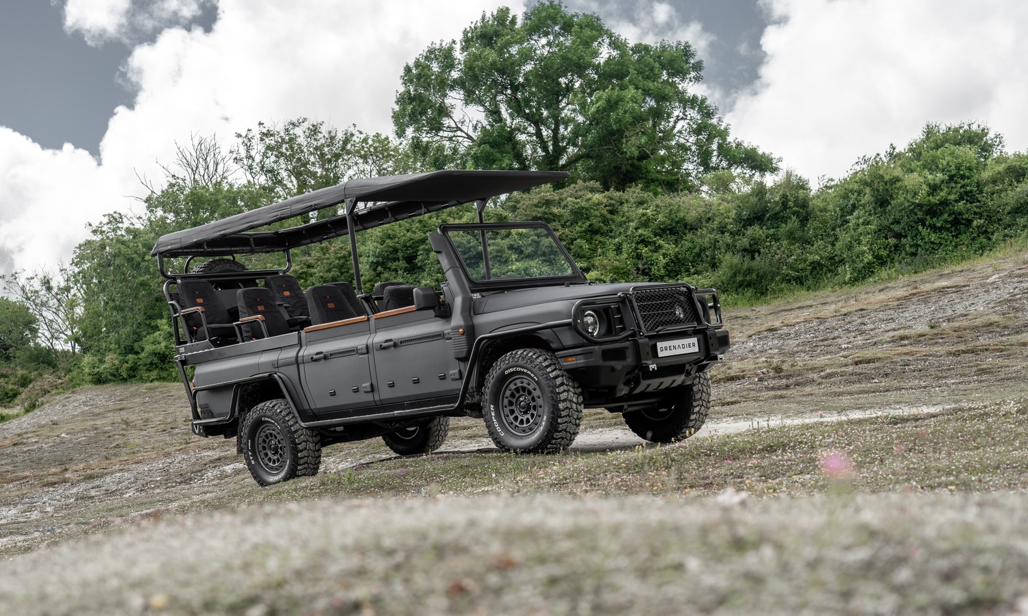 Otro elemento diferencial es el techo de lona retráctil, que sustituye al techo rígido original del Grenadier. Esta solución permite ofrecer una experiencia mucho más inmersiva, facilitando el avistamiento y la fotografía de animales desde el propio vehículo, a la vez que reduce peso y simplifica la estructura superior.