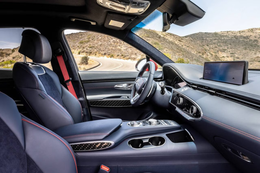 El GV70 tiene un diseño interior ligeramente diferente al de otros modelos Genesis recientes y es mejor por ello. Los asientos delanteros son muy ajustables, y los de mi vehículo de pruebas también tenían calefacción, ventilación y función de masaje. Los cojines de los asientos traseros también son muy cómodos y ofrecen una generosa reclinación.