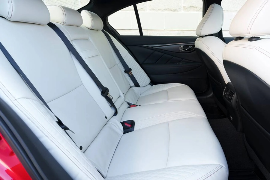Los pasajeros traseros más altos tendrán que tener cuidado con la cabeza y los pies al entrar. La visibilidad hacia delante y hacia los lados es mejor que la media gracias a los finos pilares del techo del Q50, pero la corta luneta trasera y la alta tapa del maletero comprometen la visión hacia atrás.