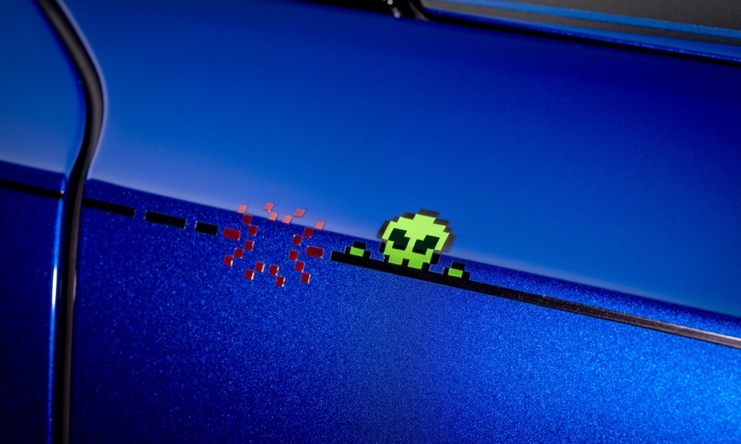 El coche luce un tratamiento bicolor exclusivo: Salamanca Blue con parte superior Crystal sobre Black Diamond, un esquema que evoca las máquinas arcade metálicas y luminosas. La clásica coachline incorpora el motivo «Cheeky Alien» pintado a mano, compuesto por 89 píxeles de 3×3 mm, acompañado de una explosión de estética 8‑bit en rosa en un lateral y en amarillo y azul en el opuesto.