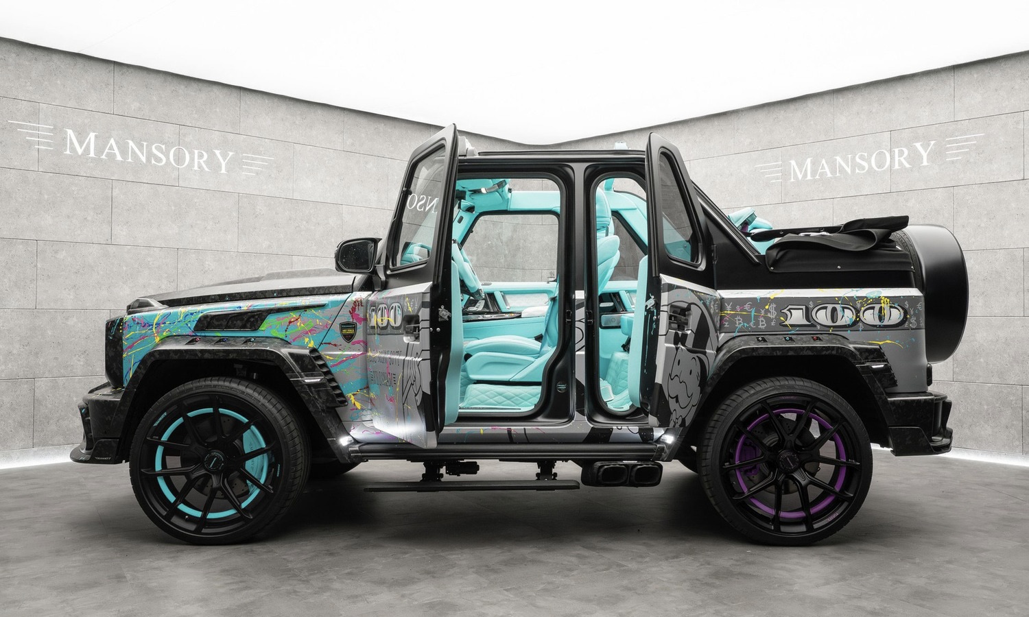 La verdadera seña de identidad del Mansory Art Piece AL3C MONO907Y está en su exterior totalmente pintado a mano. Alec Monopoly ha plasmado motivos y escenas del juego Monopoly. En ellas destaca el célebre Mr. Monopoly y acompañándolo de otros iconos de la cultura del dinero como Scrooge McDuck y Richie Rich. Los colores vivos —turquesa, rosa, amarillo, azul y rojo— cubren desde los paneles laterales a la cubierta de la rueda de repuesto.